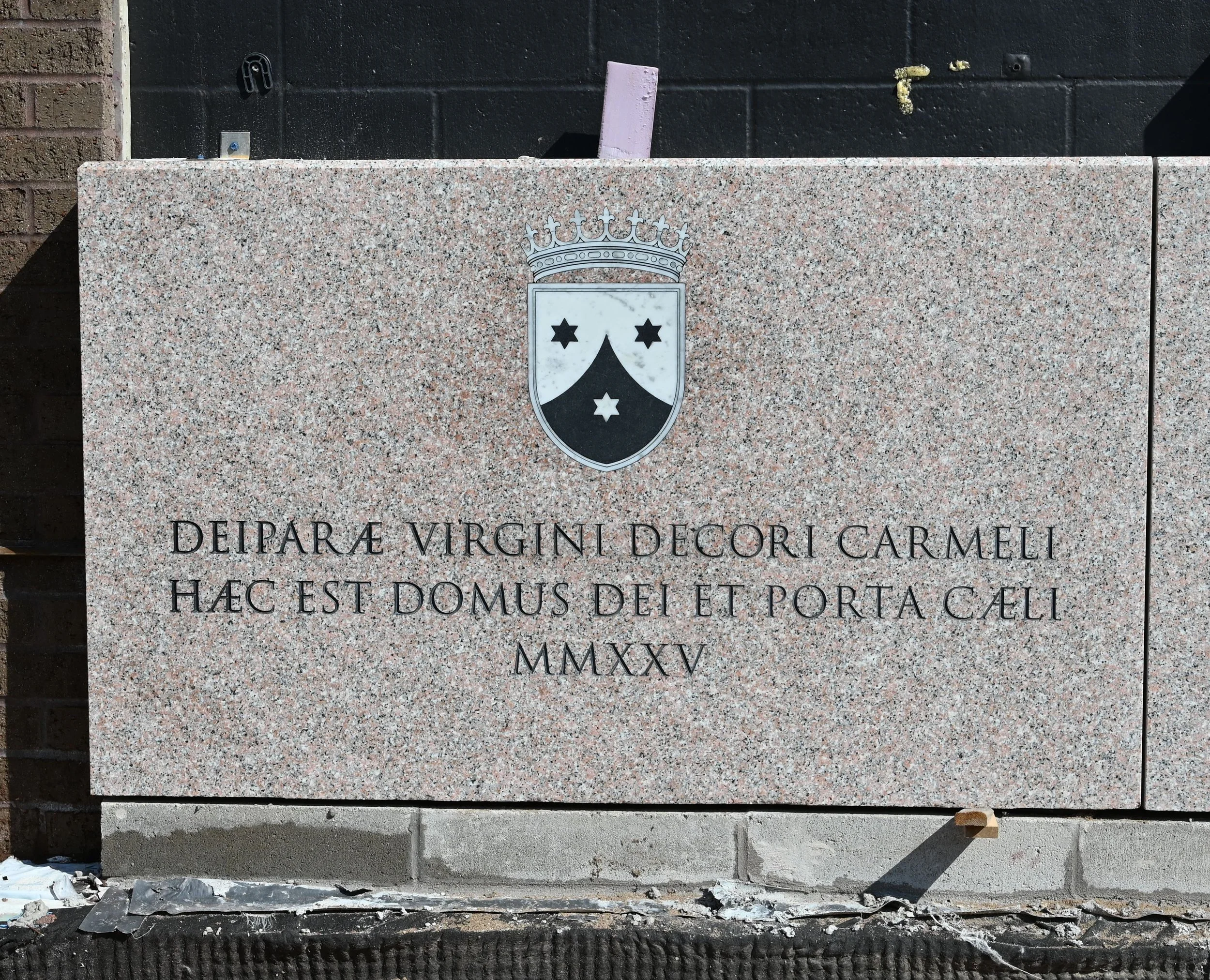 The Cornerstone with Three Lines of Inscription in Latin and the Shield of the Order of Carmel. The Latin translates: “To the Virgin Mother of God, the Beauty of Carmel”; “This is the House of God and the Gate of Heaven”; Followed by the Year of that the Cornerstone was Placed: 2025.