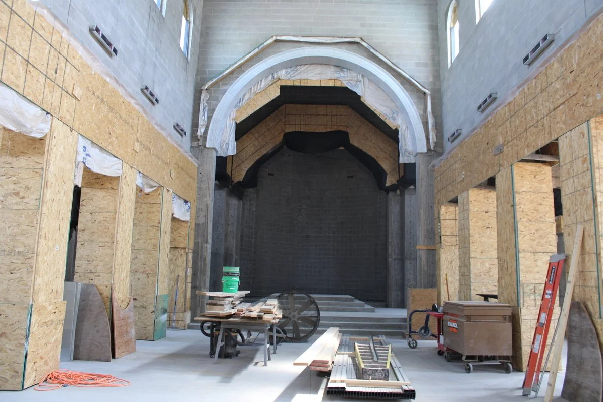 Since our previous update of March 4, 2025 the entire concrete floor has been completed - a big milestone for the interior of the chapel. Unfortunately, we were not able to take any photos before things were brought in for storage. Here is a view looking towards the sanctuary, the altar will be on the raised platform seen beyond the floor fan.