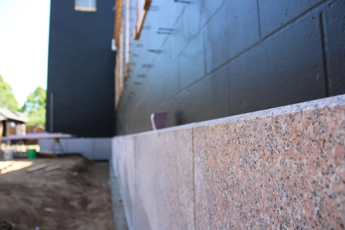 The granite still needs to be washed and the sun is strong, so please pardon the brightness of the photo above. Brick will be laid on top of the granite and form the exterior wall.
